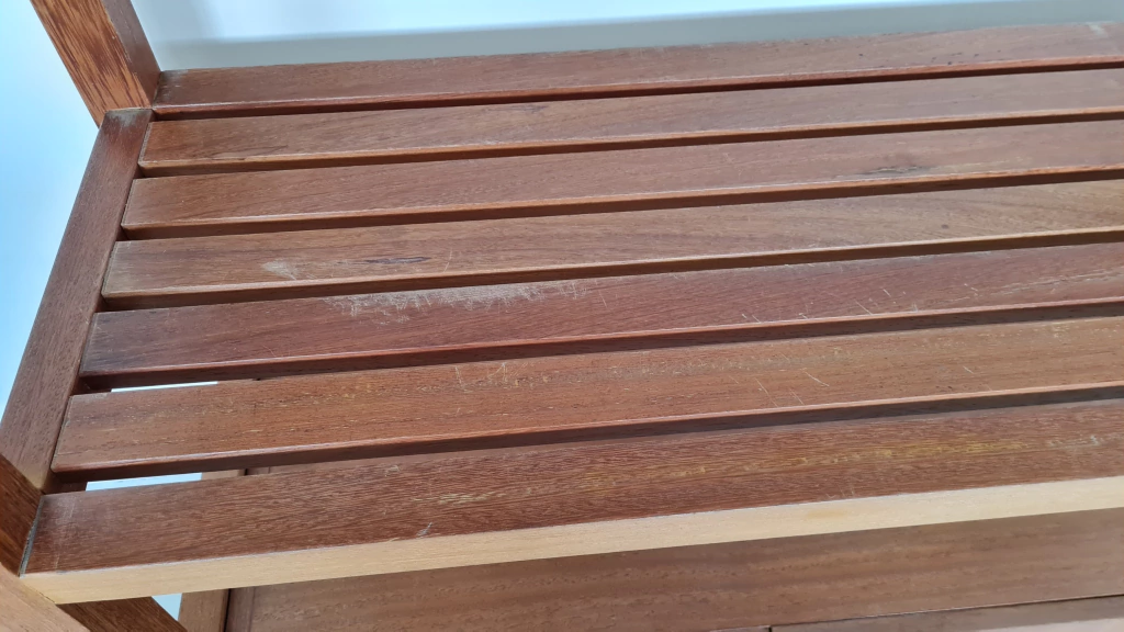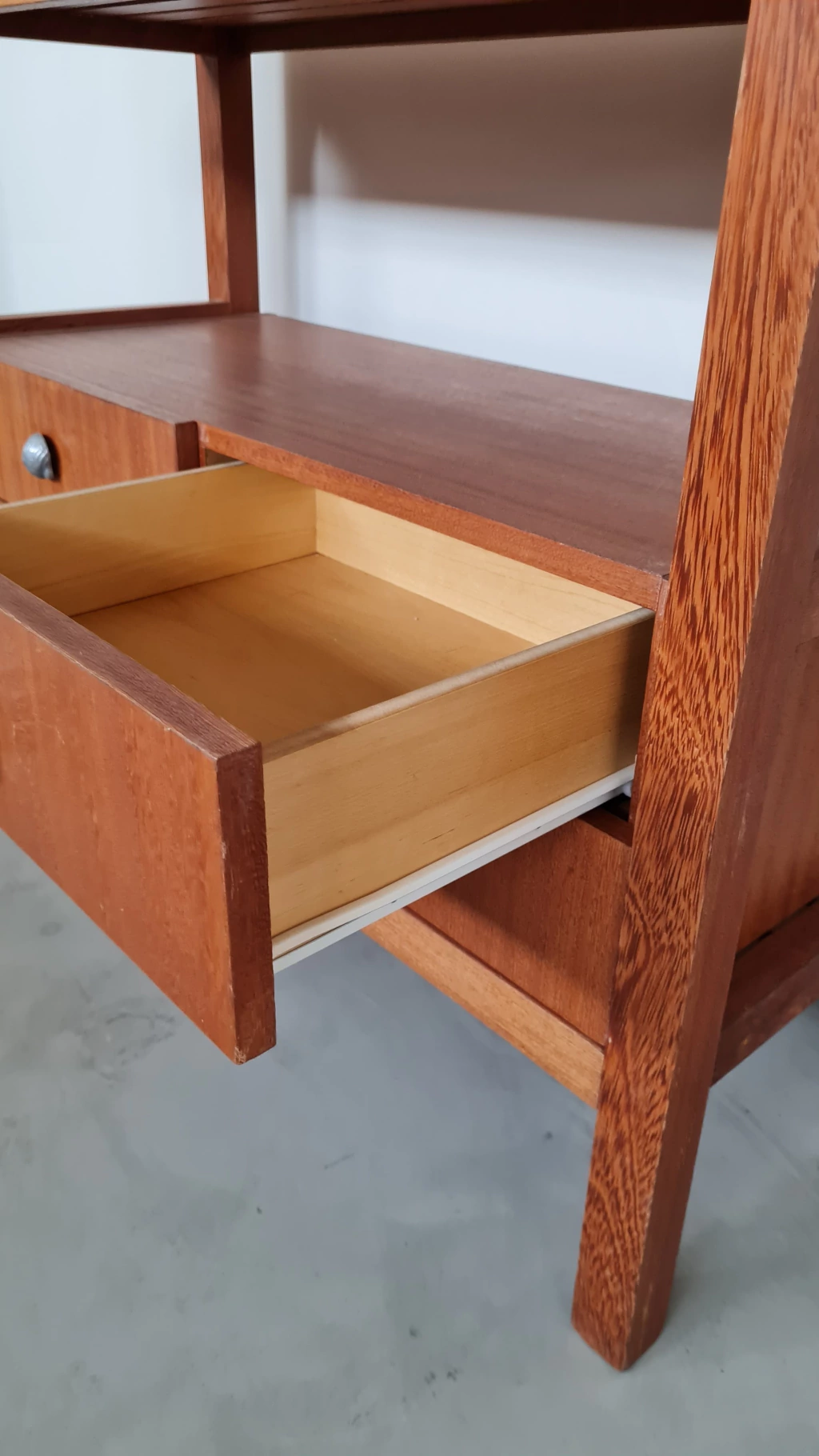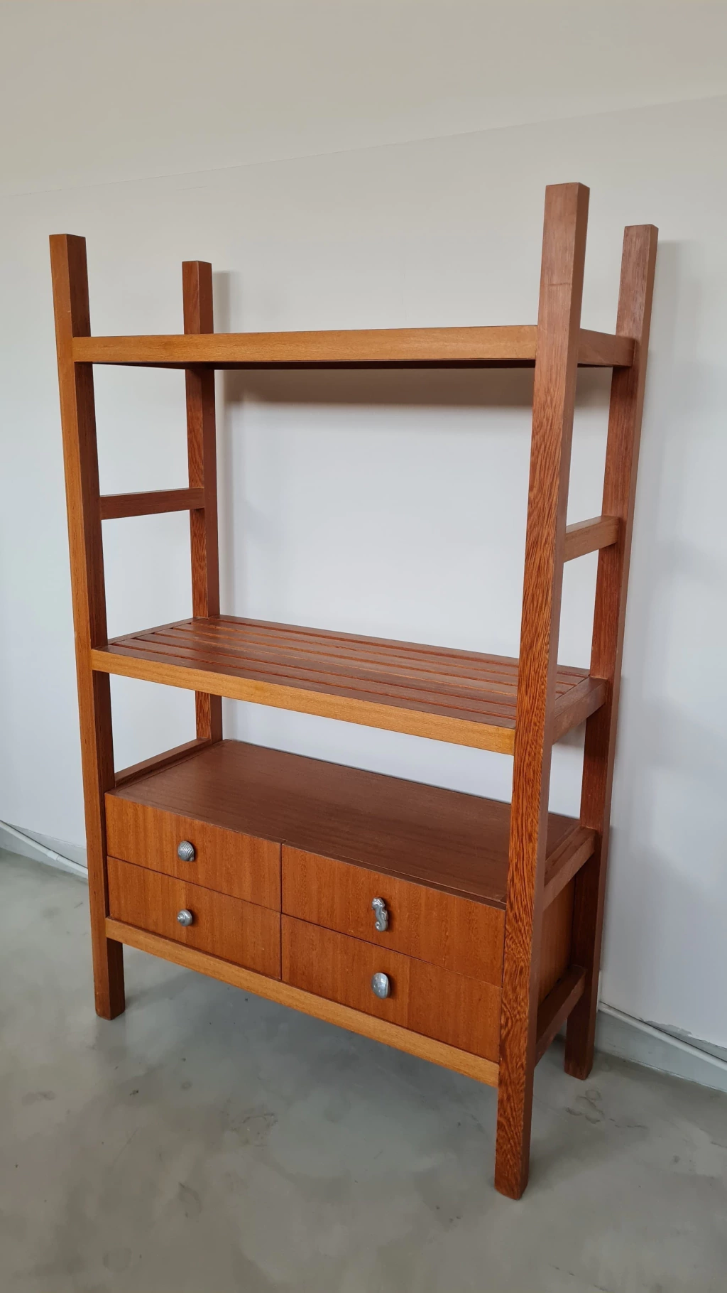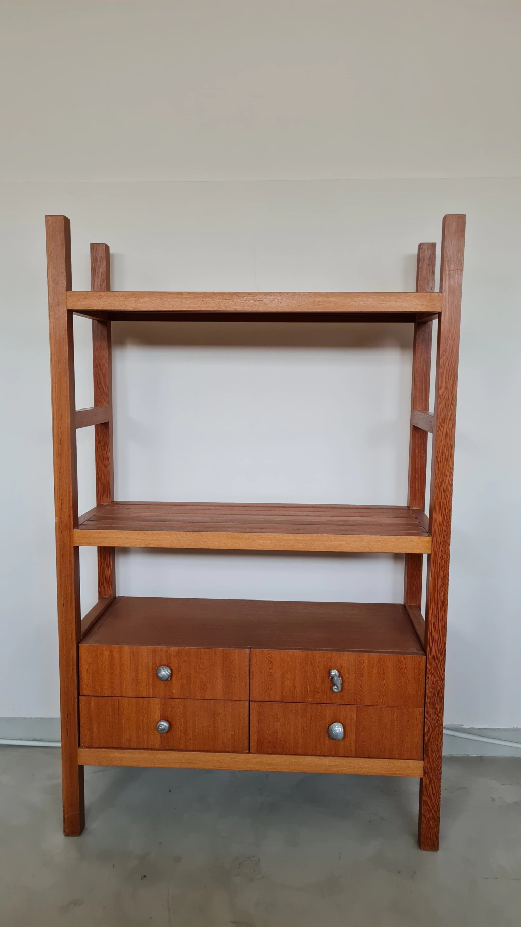Realizada en madera maciza de Tea. Estantes tipo deck y módulo de 4 cajones que se puede apoyar en cualquiera de los estantes inferiores.