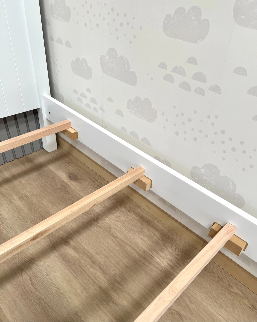 - Los elásticos de cama son de una placa de MDF perforada y pintada; y fueron diseñados para poder colocar un colchón con resortes sin dañarlo.