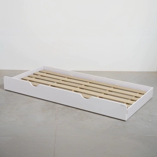 Éste modelo de Cama Carrito de cantos redondeados, posee ruedas, una sola altura y es un modelo con contención perimetral para el colchón. El frente es laqueado en laca blanca y el elástico con travesaños de madera maciza.