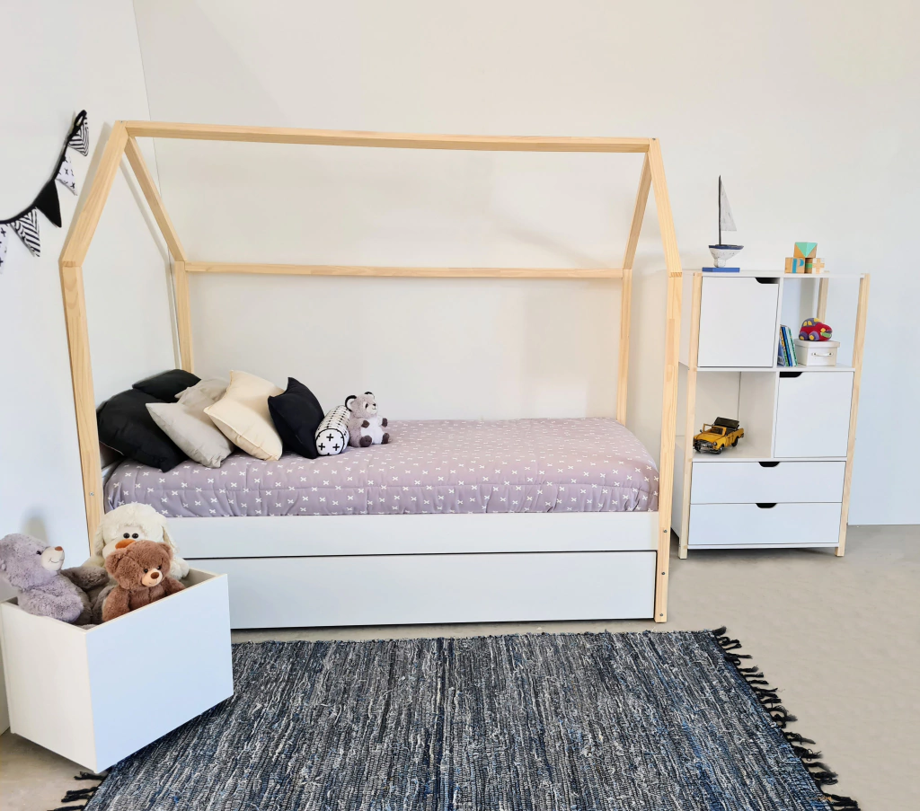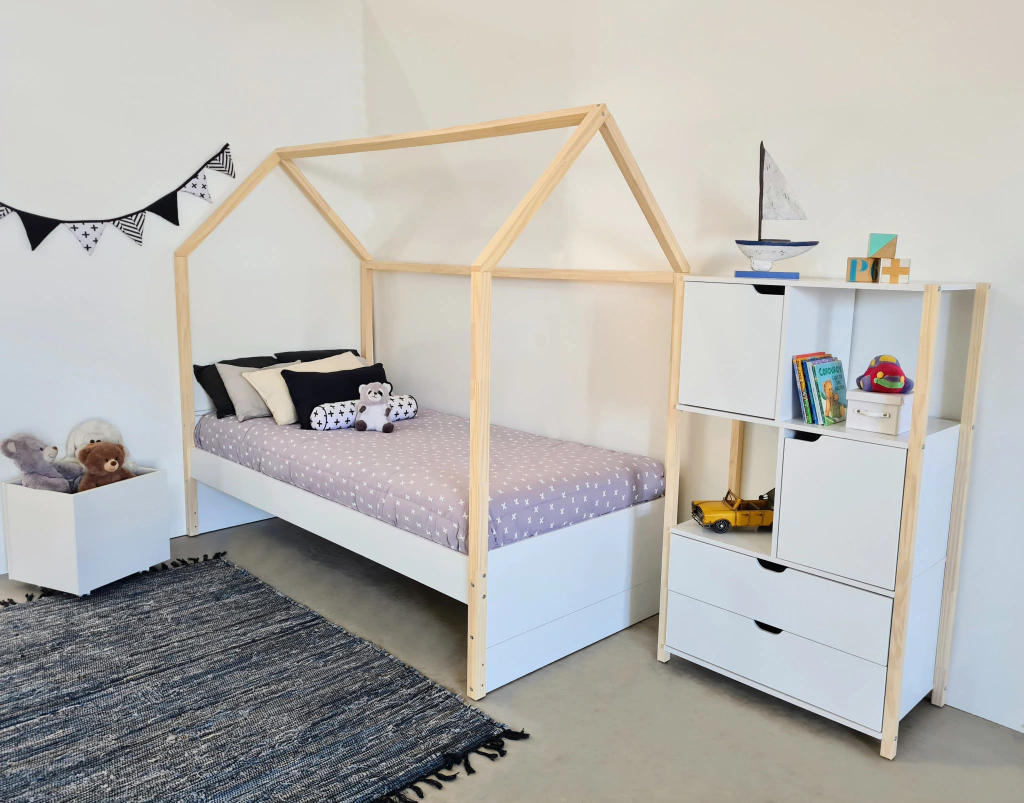 Éste modelo de Cama Casita se puede usar con la altura Montessori ( en ésta opción el colchón se coloca en la posición mas baja ). Luego a medida que el niño crece se puede elevar el colchón a la segunda altura, dando lugar para colocar una cama carrito. A este modelo no se le puede agregar baranda de proteccion.