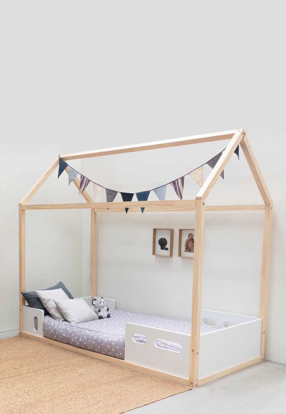 La cama casita es un modelo Montessori que se basa en la idea de que nuestro hijo se encuentre al raz del suelo para que pueda moverse en forma autónoma.