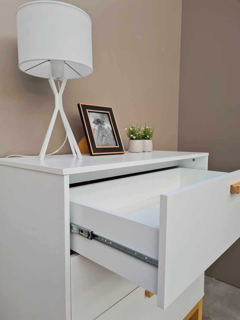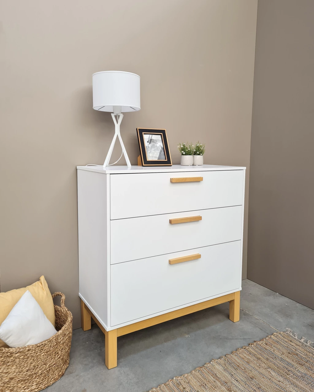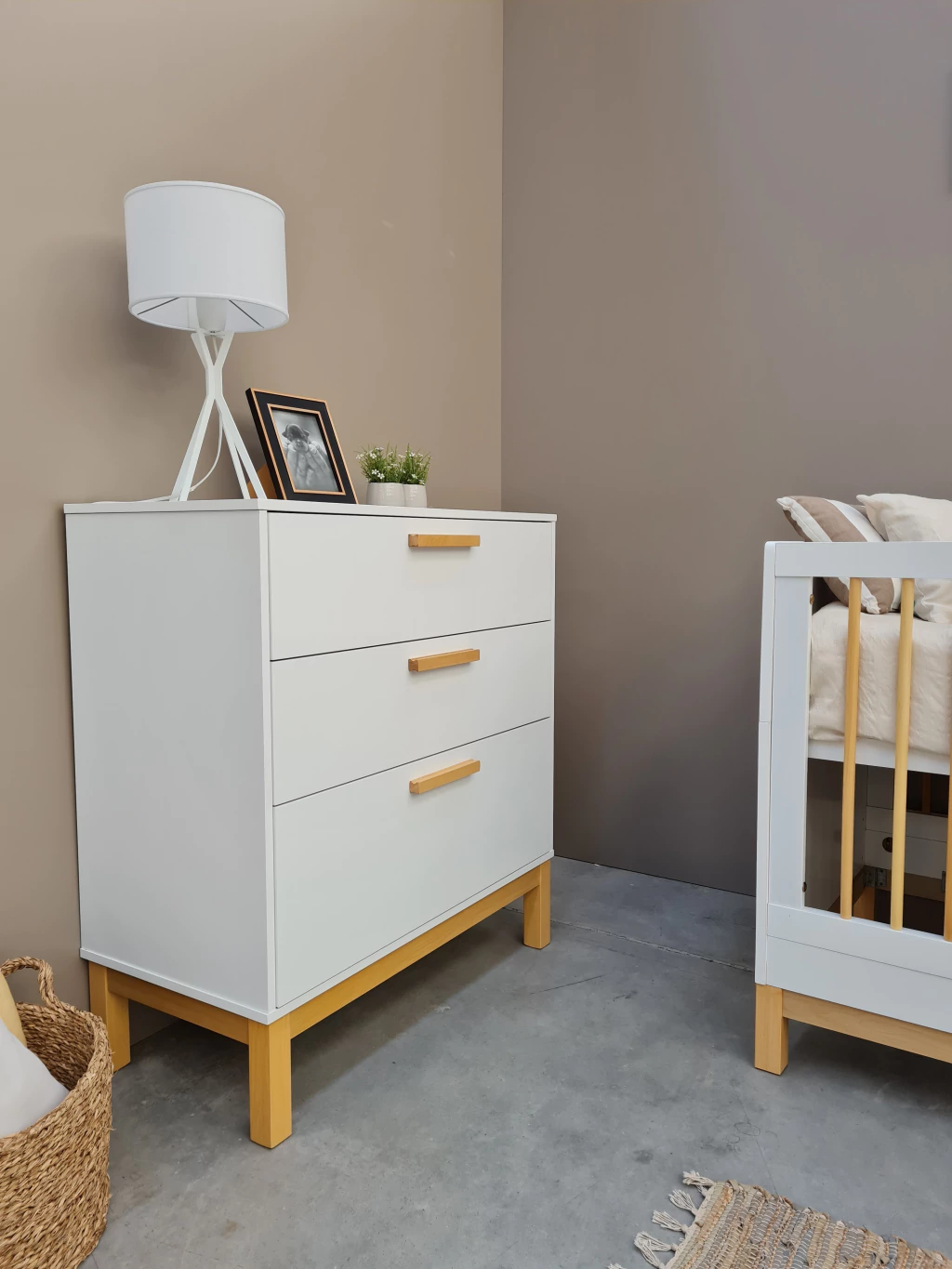Cómoda con la altura ideal para cambiar a tu bebe ✓. De lineas simples y calidas. Cuenta con 3 cajones muy amplios con guias telescopicas y sistema de apertura con tiradores. Detalle de tiradores en barra y patas en madera maciza acabado Guatambu natural.