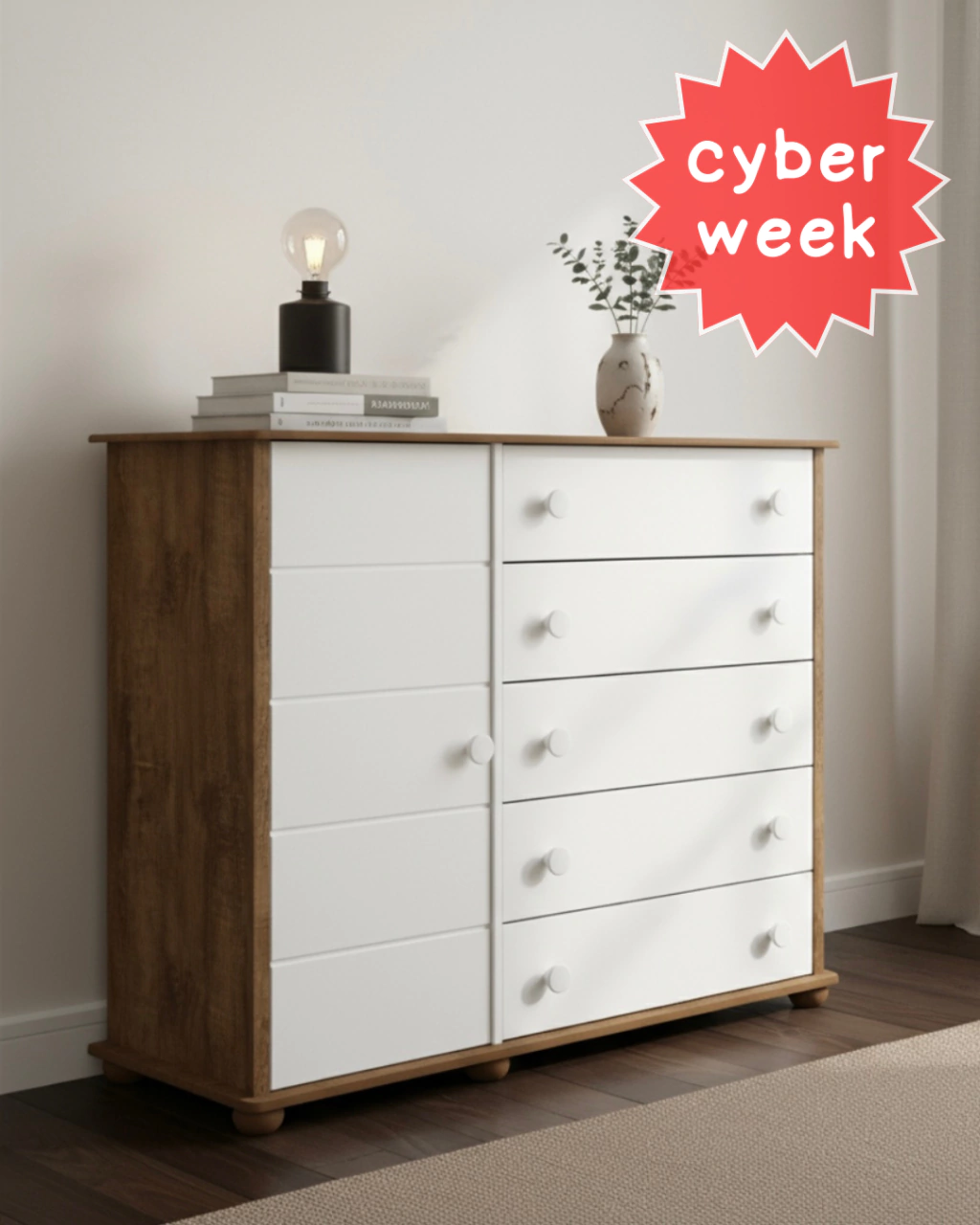 La Cómoda Fratelli cuenta con 5 cajones con correderas metálicas aseguran un deslizamiento suave y una puerta con barral de colgado y un estante interior ! Ofrece un amplio espacio de almacenamiento para ropa y accesorios. Fabricada en MDF de alta calidad con un acabado en laca poliuretánica y enchapado en melamina.