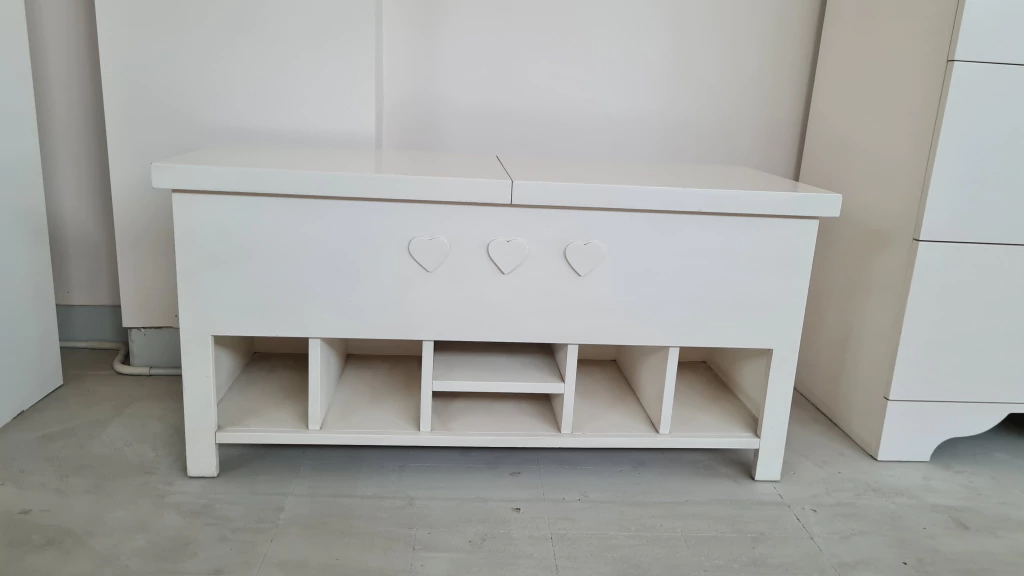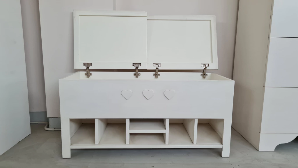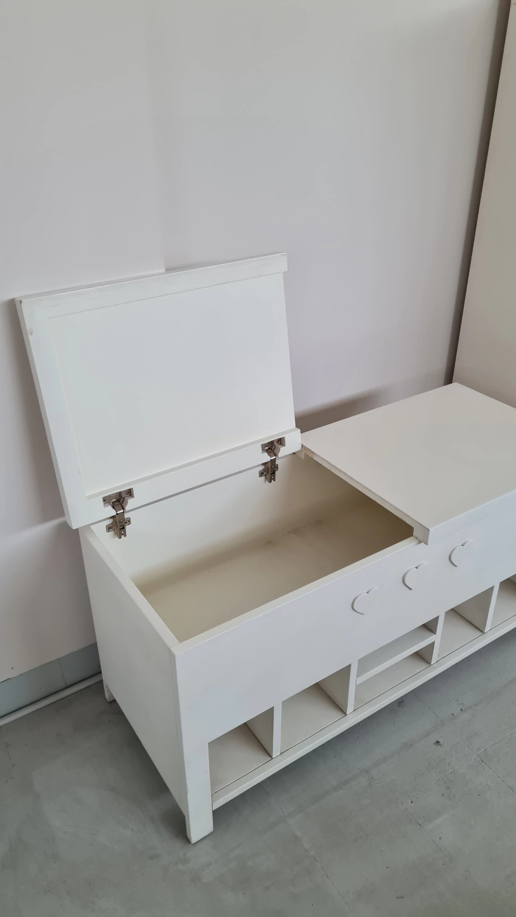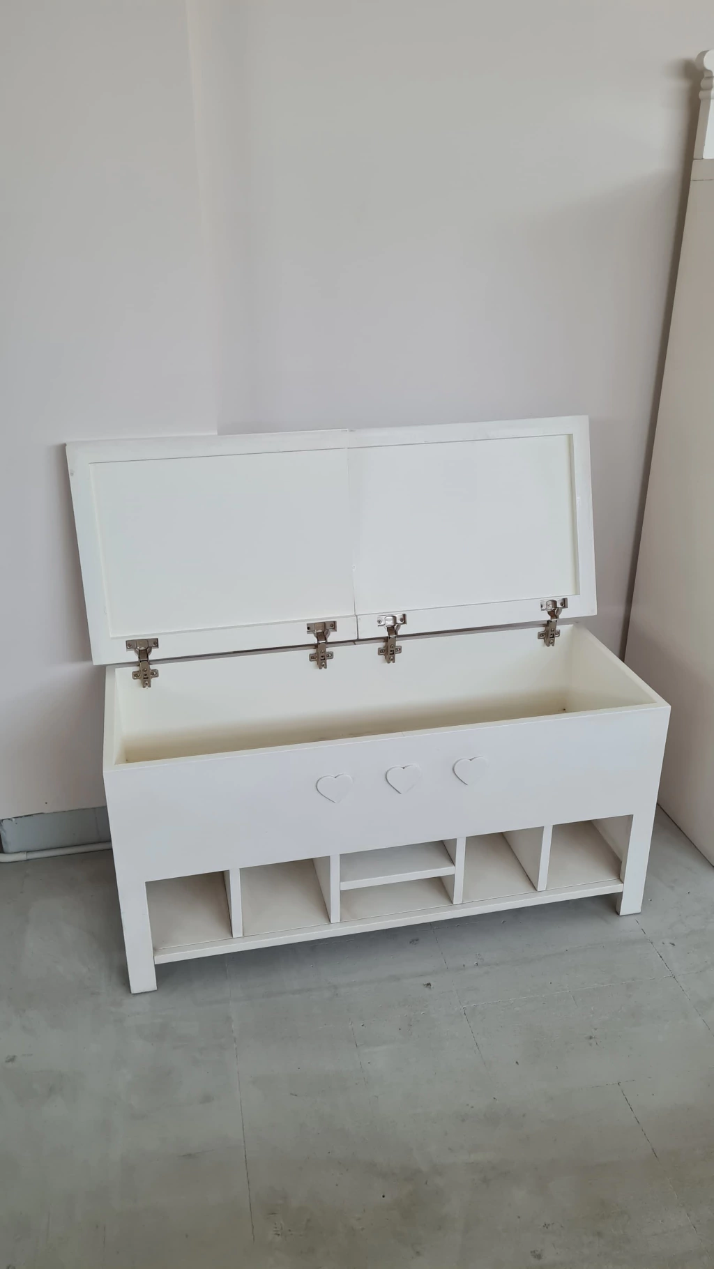 Baul de doble tapa, con huecos de guardado. Ideal para un recibidor o para el guardado de juguetes en el cuarto de los niños.