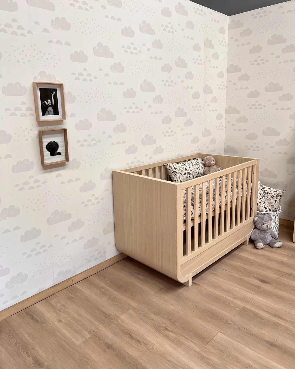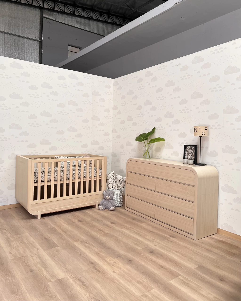 La linea MILO es una linea artesanal curvada a mano. El acabado es en lustre/pátina White Wash con respaldares de 4cm de espesor. Posee 2 regulaciones para la altura del colchón ( colecho y base ). Tiene un sistema de barandas fijas y trae 2 barandas de transición para la etapa mini cama.