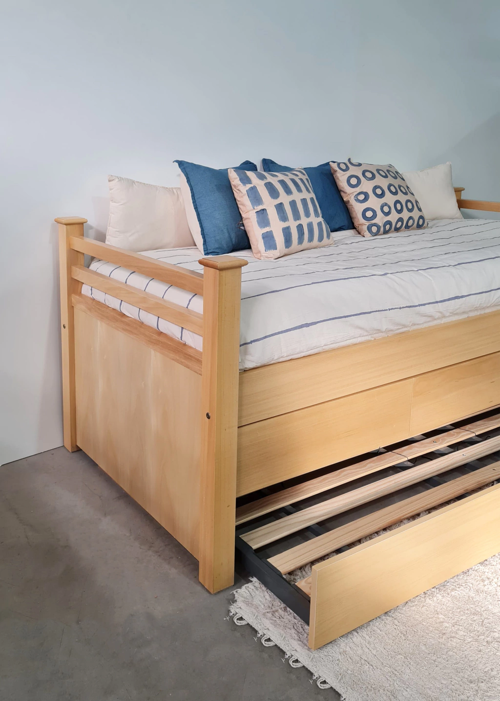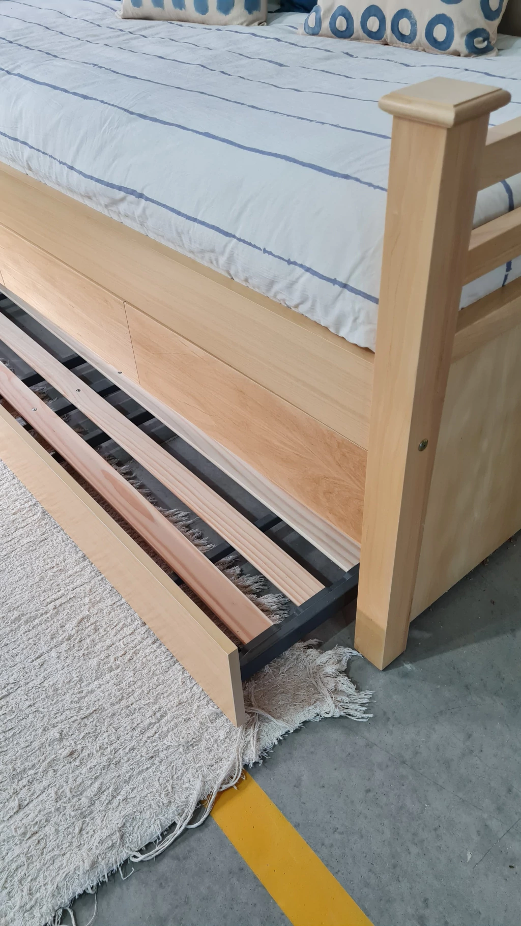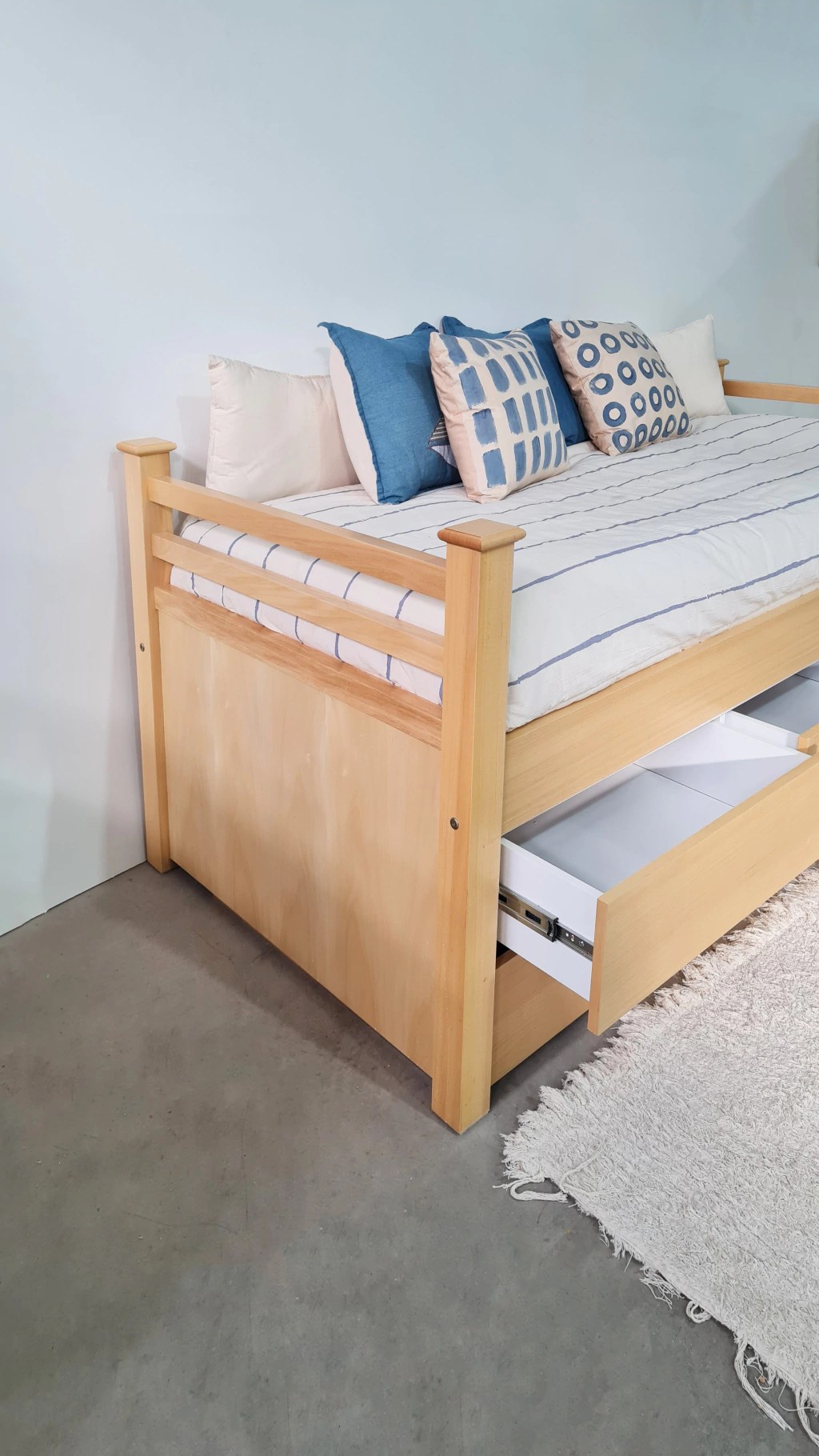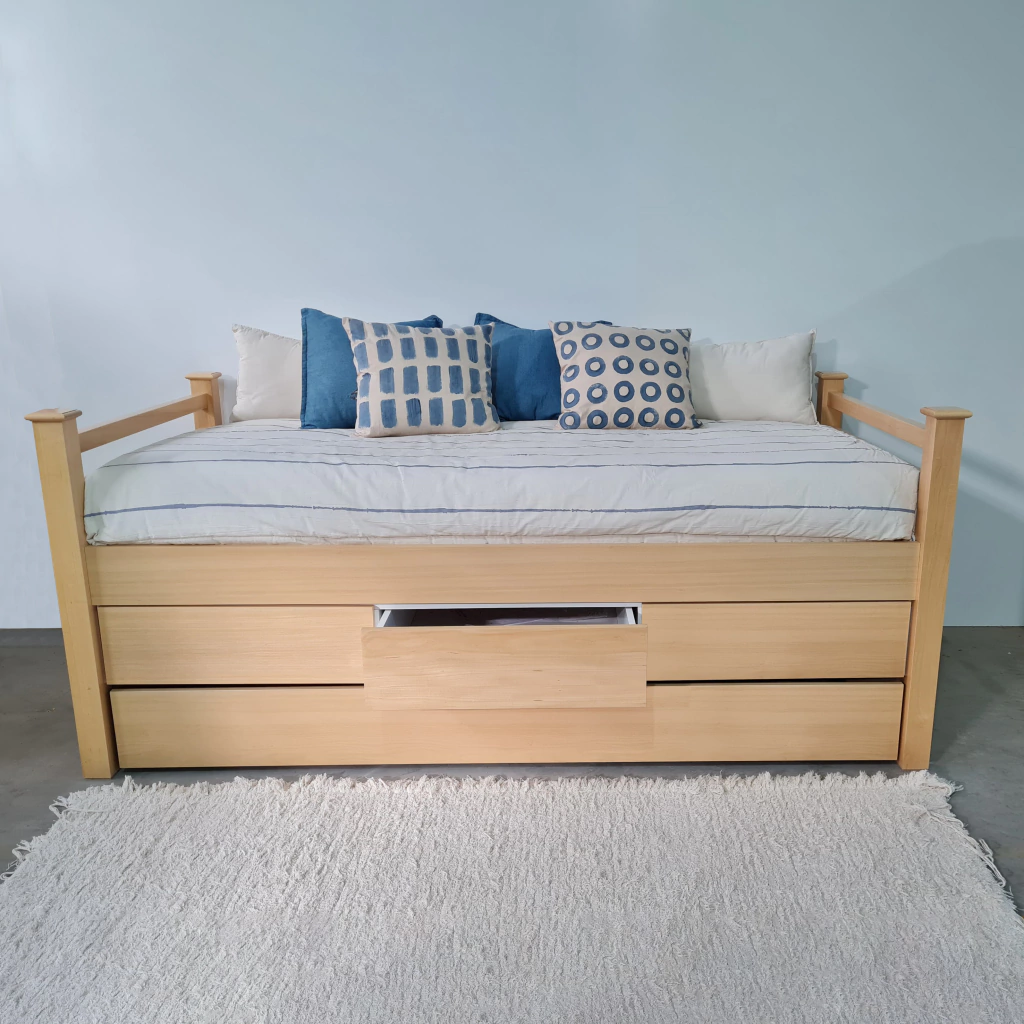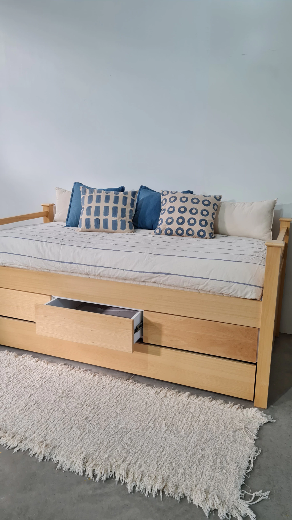Con este divan tenes en un solo espacio: la cama principal, 3 cajones super amplios de 70cm de profundidad con guías telescópicas y sistema de apertura con uñero, cierre suave y por debajo, una Cama Carrito que se eleva.