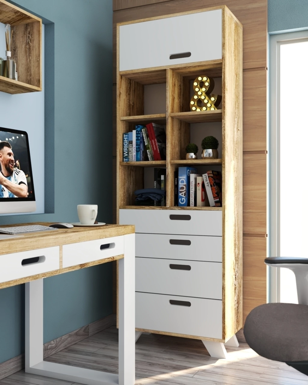 Material: Fabricado en Melamina sobre Aglomerado y MDF Laqueado. Acabados en laca poliuretánica no tóxica de primera calidad. Color ATAKAMA y BLANCO