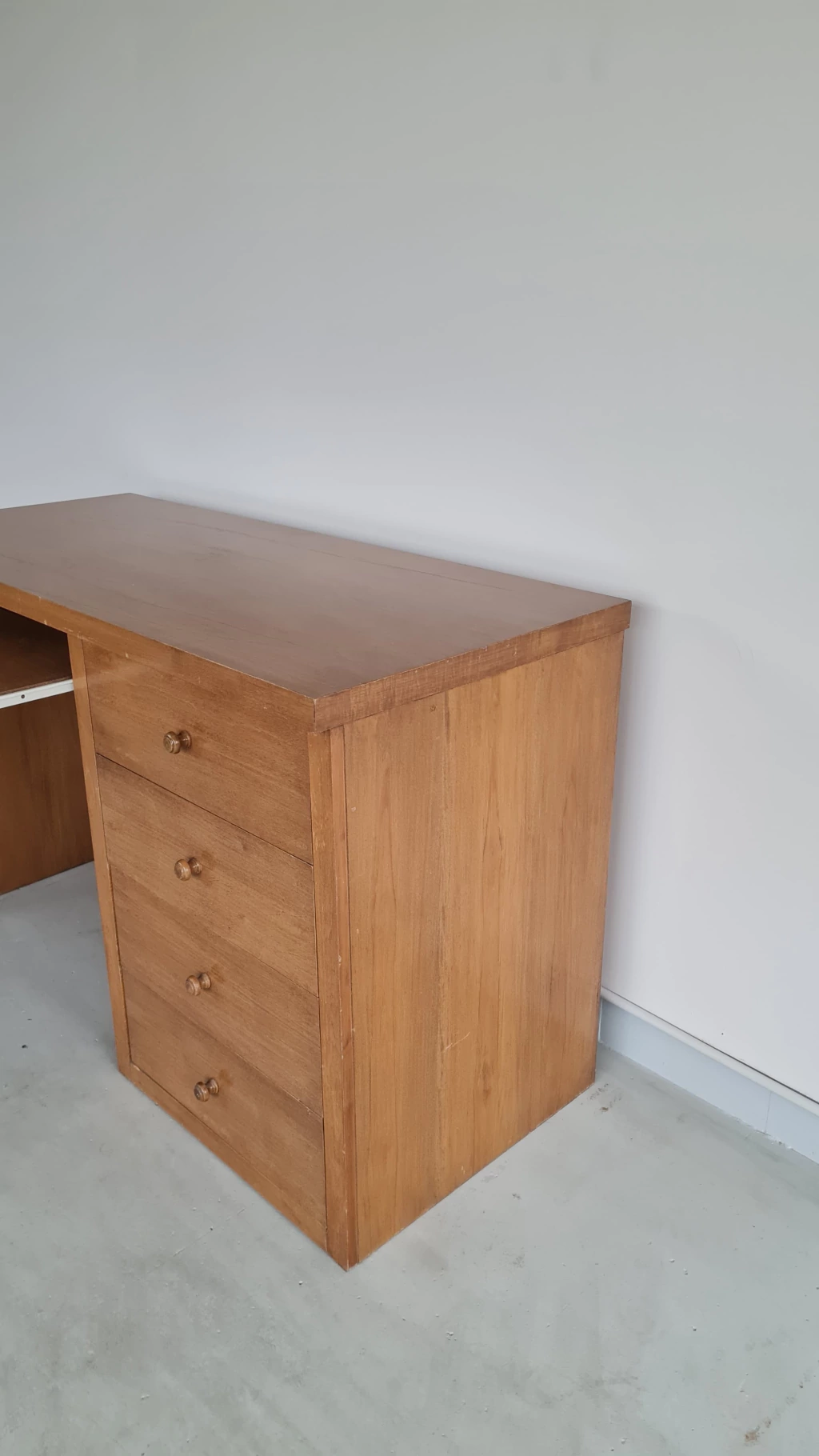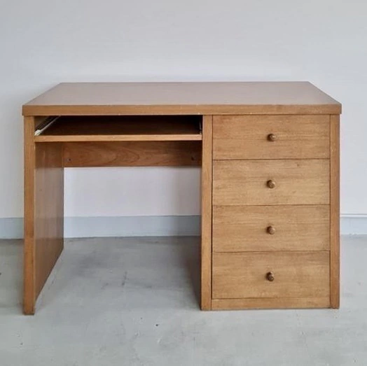Escritorio de lineas rectas, con cajonera lateral de 4 cajones y bandeja deslizable. Acabado en guatambu lustrado.