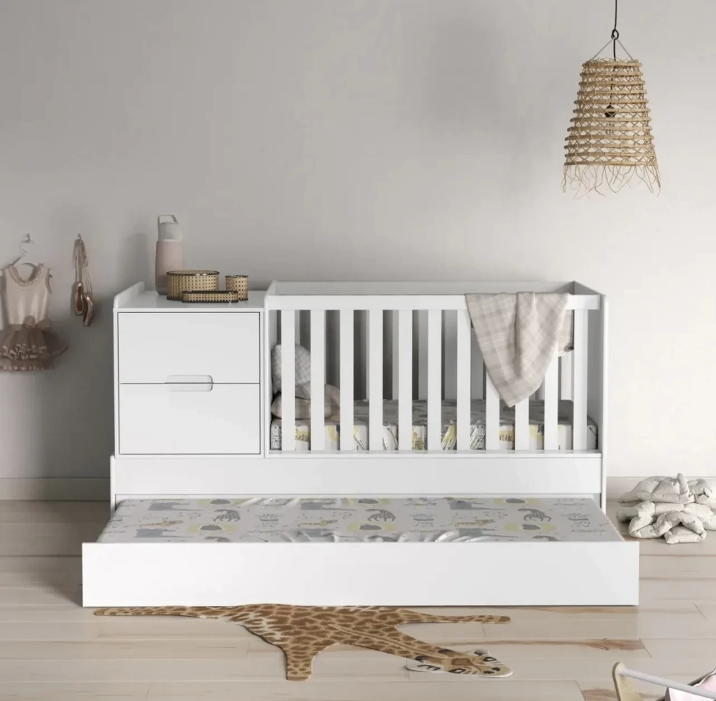 Este modelo primero se utiliza como cuna funcional. Cuenta con diferentes alturas para regular el colchon y 2 barandas fijas. La completa una cajonera lateral para cambiar al bebe ( con 2 cajones con guias telescopicas y un modulo de guardado con estantes ). Termina con una cama carrito y las barandas de trancision de mini cama incluidas en el precio.