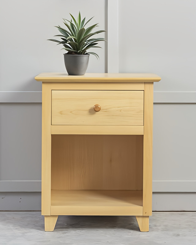 La mesa de luz Gaby tiene espesores de 4cm y patas de madera maciza.Cuenta con 1 cajon superior y la tabla con vuelo.