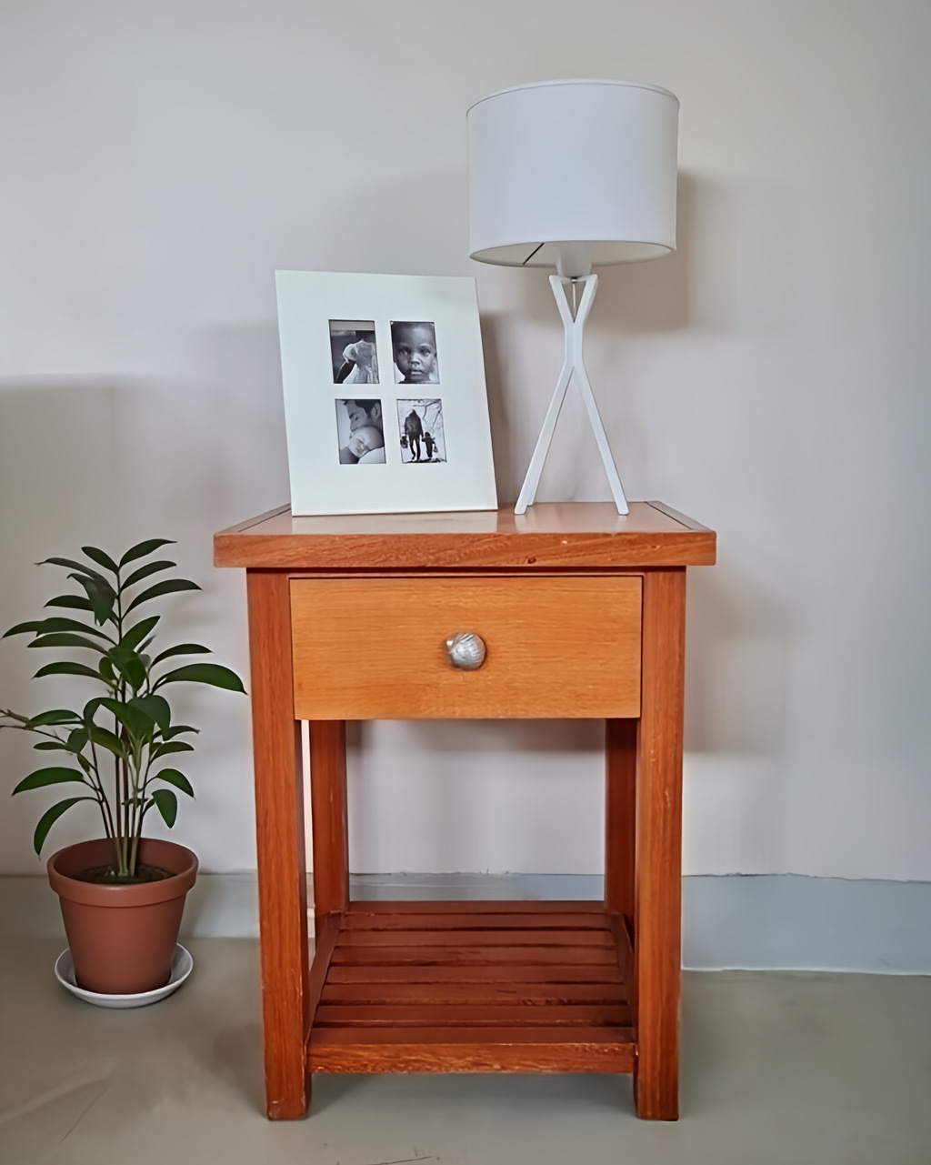 Esta Mesa de Luz se caracteriza por sus imponentes espesores frontales que la hace muy robusta. En este caso se encuentra fabricada con la exclusiva madera de Tea importada. Debajo del cajón cuenta con un estante tipo deck.