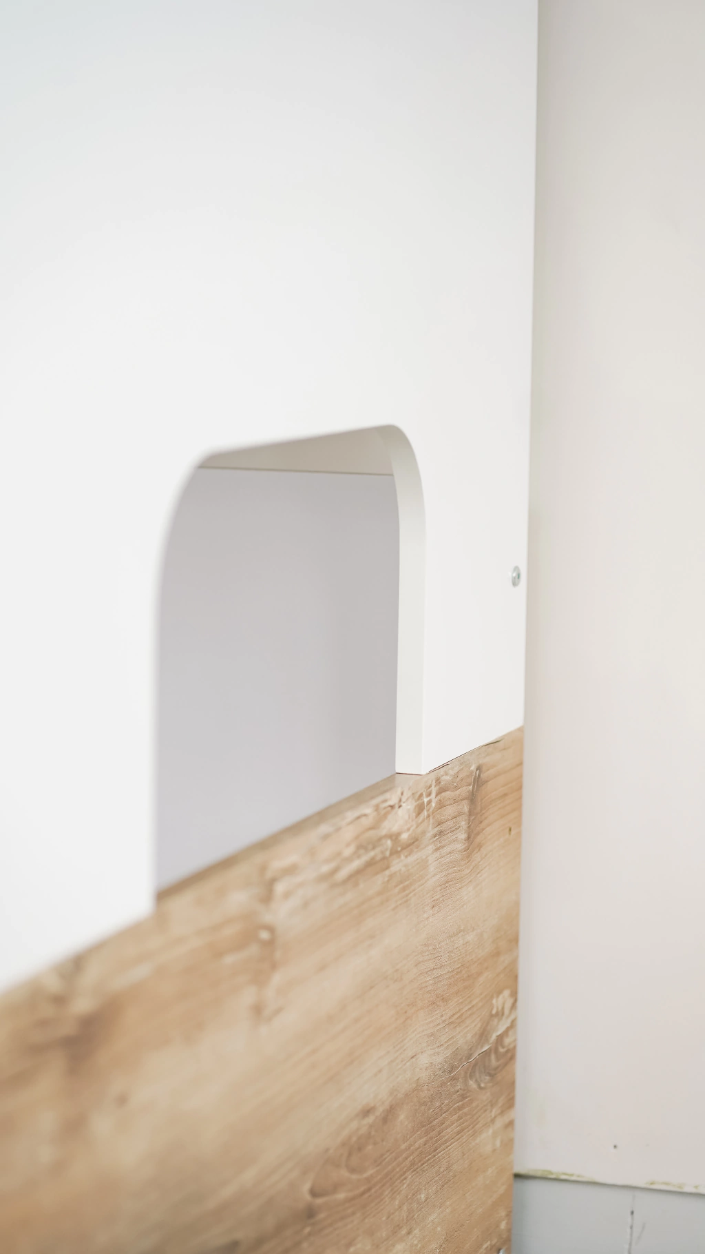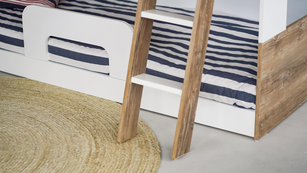 Material: Fabricada en Melamina sobre Aglomerado y MDF Laqueado. Combinada en color blanco y detalles en simil madera. Los travesaños estructurales son de madera maciza.Utilizamos laca poliuretánica no tóxica de primera calidad en todos nuestros mobiliarios. Resiste un peso de 80k aprox.